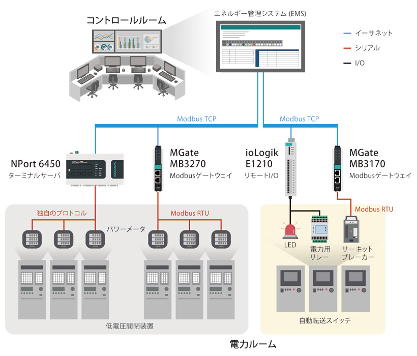 低電圧開閉装置およびATS内のさまざまな電源装置(電力リレー、電力計、回路ブレーカーなど)は、EMSに接続して通信する必要がありました。 NPort 6450セキュアターミナルサーバー、MGate MB3170 / MB3270 Modbusゲートウェイ、およびI/OLogikE1210リモートI/Oにより、さまざまなインターフェースとプロトコルの接続が可能になりました。さらに、Moxaの製品は、使いやすい構成ツール、ネットワークトポロジーを簡素化するイーサネットカスケード、および通信エラーが発生したときにエンジニアが根本原因を簡単に特定できるようにするModbusプロトコルトラブルシューティングツールをサポートしています。