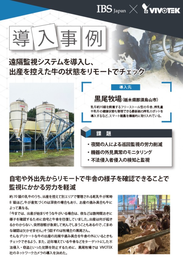 昼夜を問わず、長時間に及ぶことや急変することもある牛の出産の兆候や進み具合をリモートで確認できたら...VIVOTEKのソリューションなら、自宅や外出先からの牛舎のリモート監視を可能にし、小規模経営や人手不足に悩む現場の悩みを解決します。