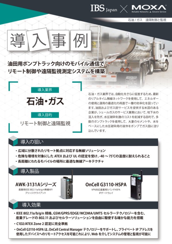 石油・ガス業界では、自動化をさらに促進するため、最新のリアルタイム無線ネットワークを使用して、エネルギーの使用と運用の最適化の両面で一層の効率化を図っています。油田およびガス田サービスを提供する米国のある企業が、シェールガスのサービス業務において、地下水の混入を防ぎ、水圧破砕刺激のコストを削減する目的で、多数のポンプトラックを使用して、大量のセメントや、水をベースにした水圧破砕用の液体をポンプでガス田に送り込んでいます。