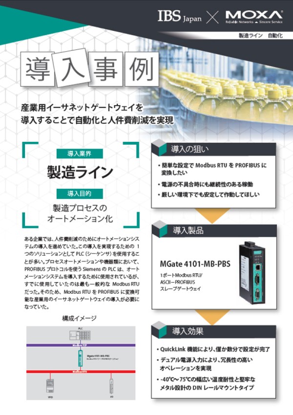 ある企業では、人件費削減のためにオートメーションシステムの導入を進めていた。この導入を実現するための1 つのソリューションとしてPLC(シーケンサ)を使用することが多い。プロセスオートメーションや機器類において、PROFIBUSプロトコルを使うSiemensのPLCは、オートメーションシステムを導入するために使用されているが、すでに使用していたのは最も一般的なModbus RTUだった。そのため、Modbus RTUをPROFIBUSに変換可能な産業用のイーサネットゲートウェイの導入が必要になっていた。