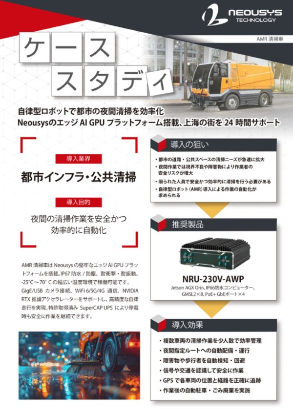 AMR清掃車はNeousysの堅牢なエッジAI GPUプラットフォームを搭載。IP67防水/防塵、耐衝撃・耐振動、-25°C~70°Cの幅広い温度環境で稼働可能です。GigE/USBカメラ接続、WiFi 6/5G/4G通信、NVIDIA RTX推論アクセラレーターをサポートし、高精度な自律走行を実現。特許取得済みSuperCAP UPSにより停電時も安全に作業を継続できます。