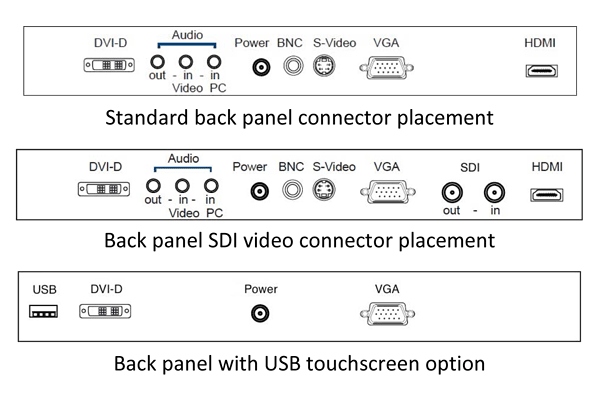 標準のリアパネルコネクターは、1 VGAおよび1 DVI-Dビデオとオプションとして利用可能な他のビデオコネクターが含まれています。4Kモデルには、DisplayPortコネクターが提供されます。ビデオ信号をホストコンピューターまたはビデオソースに接続するための2.0mのケーブルが付属しています。