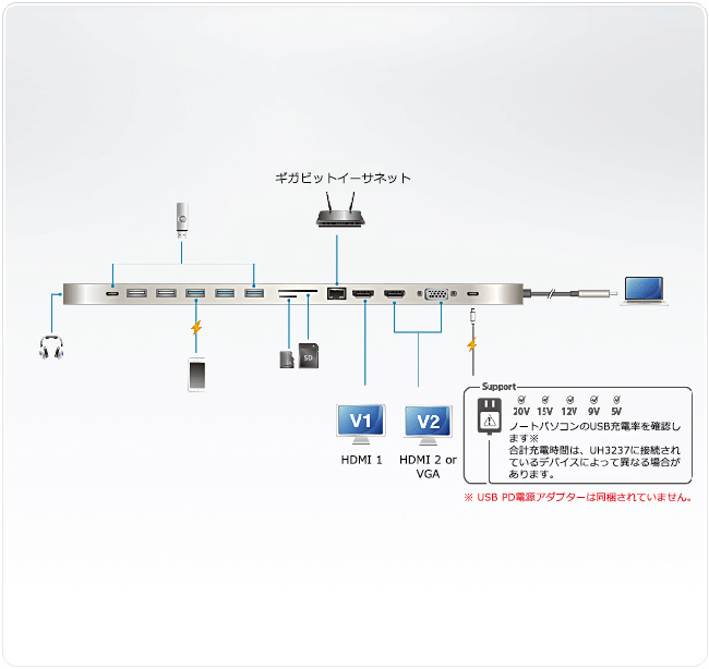 | UH3237 | USB Type-C PD3.0/パススルー給電対応ドッキングステーション (13in1) |
