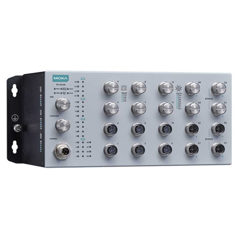 | TN-4520B-12P-4GP-4GBP-CT-T | 10/100/1000BaseT(X)PoEポート (M12 Xコード 8ピン メスコネクター):4 10/100/1000BaseT(X)ポート (M12 Xコード 8ピン メスコネクター、バイパスリレイ付き):4 10/100BaseT(X)PoEポート (M12 Dコード 4ピン メスコネクター):12 PoE電力バジェット:150W |
