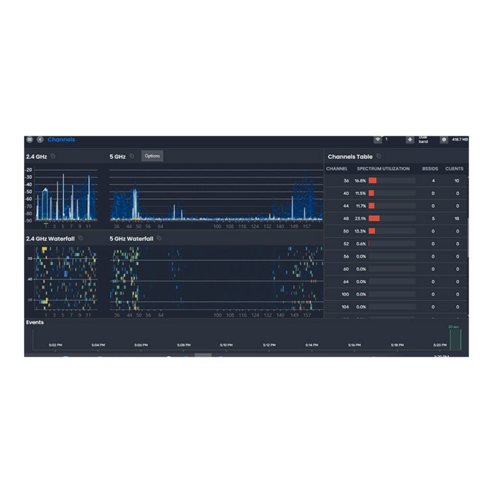 Chanalyzerは単にアクセスポイントのリストを表示するだけではありません。RFの全体像を詳細に分析します。Wi-Spy Lucidの洞察とAPデータを組み合わせることで、チャネルの使用状況を分析し、混雑を管理し、ついにあの煩わしい断続的な干渉の原因を特定できます。