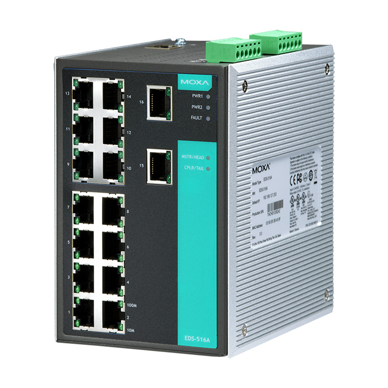 イーサネットは今日の工業オートメーションアプリケーションでのデフォルトデータ通信手段となりました。実際には、ビデオ、音声および高速工業アプリケーションデータ通信を1つのネットワークに統合する事は珍しい事ではありません。ギガビット・ターボリングと呼ばれるリダンダント・ギガビット・イーサネット・プロトコルを使用するMoxa EDS-516Aはシステム管理者に多目的かつ安定したギガビット・イーサネット・ネットワークの設定においての便利性を提供します。ギガビット・ターボリングを利用するとネットワークのいずれかのセグメントが切断されていても、オートメーションシステムは、従来の300ミリ秒以内から世界最小の20ms以内に元に戻ります。