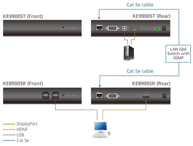 KE9900STは、PCのコンソール(USBキーボード/マウス・DisplayPortモニタ)をイントラネット経由で延長できるDisplayPort対応のスリムタイプIP-KVMトランスミッタです。本製品を導入することでコンピュータをワークステーションから隔離し、安全で温度管理された環境に設置することが可能となります。またKEシリーズ製品※と互換性があり、他のKEレシーバと組み合わせて使用し、コスト削減を図ることが可能です。