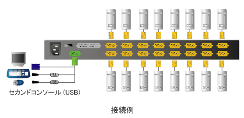 - セカンドコンソールポート ― セカンドコンソール(モニタ、USBキーボード、USBマウス)からもLCD一体型KVMPスイッチに接続したコンピュータの操作が可能