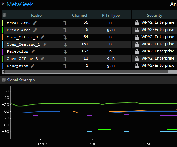 チップセットメーカによりRSSI値は大きく異なりますので、MetaGeekのソフトウェアは、より一般的な受信信号強度の絶対値、つまりdBm単位の受信信号電力を使用します。この値は多くの計算が必要ですが、基本的には0dBmに近いほど優れた信号です。