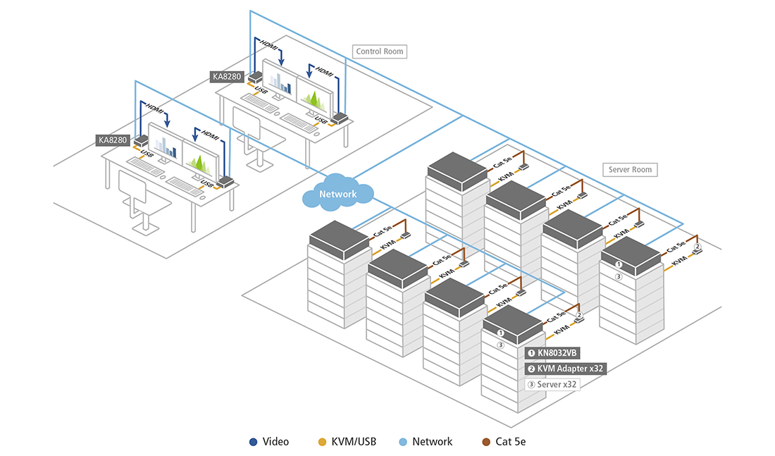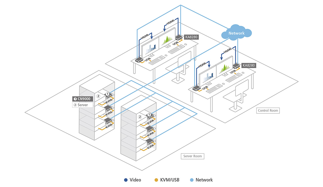 コントロールルームの展開は、各コンピュータに1ポートのIP KVMスイッチ(CNシリーズ)をトランスミッターとして接続する柔軟な方法(専用セットアップ)や、複数のコンピュータを高密度IP KVMスイッチ(KNシリーズ)にまとめて簡易インストールする方法(集約セットアップ)のいずれかです。両方のセットアップは、セキュアなリモートアクセスを備えたコンソールステーション(KA82シリーズ)を介して管理でき、コントロールルームの生産性を損なうことなくネットワークの柔軟性を確保します。堅牢なIP KVMセットアップは、時間を節約するインストールを実現し、異なるコントロールルームの要件に関連するさまざまな予算に対応します。