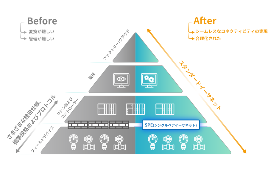 SPEは、従来のイーサネット(4ペアケーブル)の代わりに1本のツイストペアケーブルを用い、従来のイーサネットの到達範囲と柔軟性を拡張し、Industry 4.0のコネクティビティをより簡潔かつ柔軟に変革する次世代技術を提供します。この革新的な技術は、プロセス計測機器などの産業用エッジデバイスを接続するだけでなく、製造プロセスへのデジタル技術のシームレスな統合も可能にします。